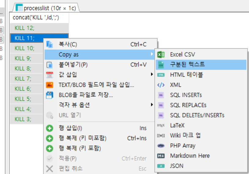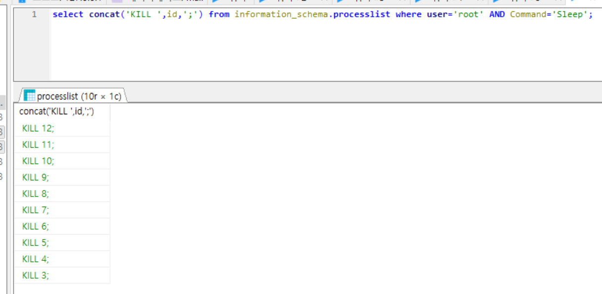select concat('KILL ',id,';') from information_schema.processlist where user='๋์ID' AND Command='Sleep';